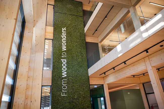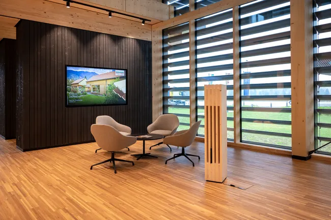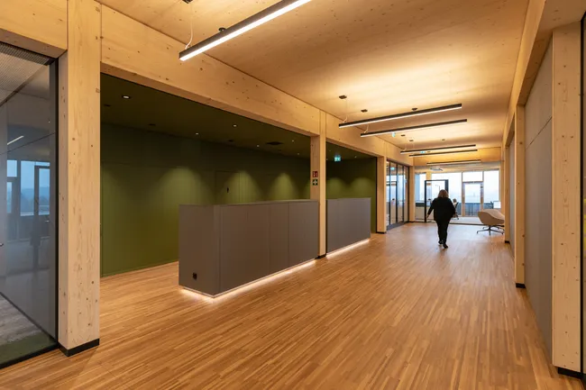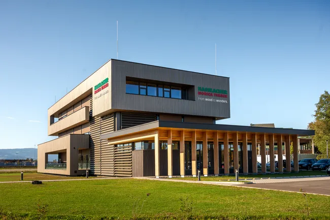 Природну естетику дерева архітектори Trecolore підкреслили природною колірною концепцією. Зовні різні відтінки деревини та зелені насадження створюють гармонійне поєднання. Усередині будівлі повторюються ті ж кольори: зелені стінові елементи утворюють приємний контраст із ялиновою деревиною з поверхнею HASSLACHER Exzellent на стінах і стелях.