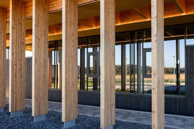 Використовувати дерево не лише як високоефективний будівельний матеріал, а й показати його природну красу — стало однією з головних ідей архітектурного задуму. Від фасаду до стін і стель у внутрішніх приміщеннях дерево створює сучасну естетику. Для довговічного захисту фасада головної будівлі використовували лазур з ефектом зістарення Lignovit Platin від ADLER у двох відтінках сірого та коричневого.